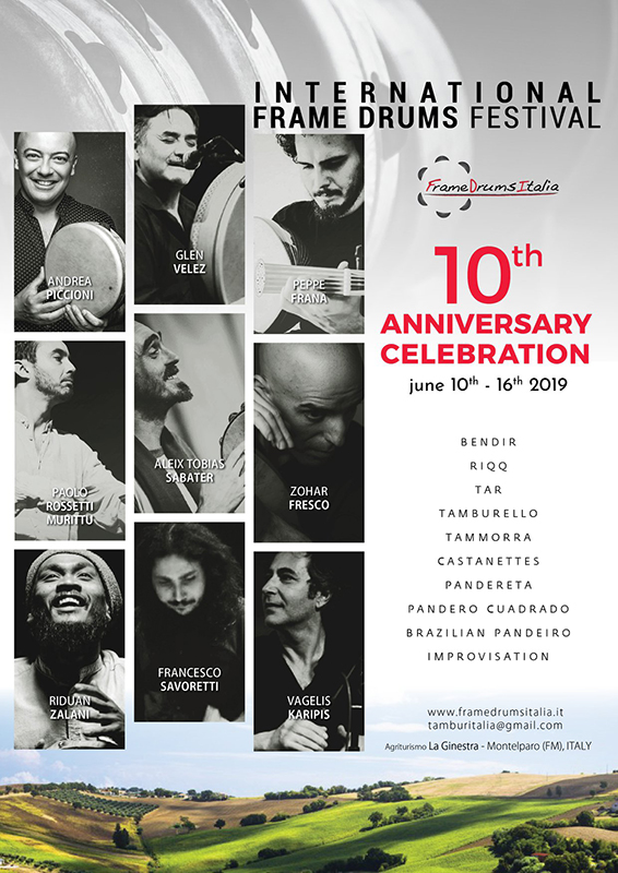 Dal 10 al 16 giugno a Montelparo (FM), X edizione dell’International Frame Drums Festival, rassegna dedicata ai tamburi a cornice (bendir, riqq, tar, tamburello, tammorra, castanettes, pandereta, pandero cuadrado, pandeiro brasiliano…). Organizzato da Frame Drums Italy, il festival vedrà impegnati autentici specialisti quali Andrea Piccioni, Glen Velez, Pepe Frana, Paolo Rossetti Murittu, Aleix Tobias Sabater, Zohar Fresco, Riduan Zalani, Francesco Savoretti e Vangelis Karipis e si svolgerà presso l’agriturismo La Ginestra di Montelparo.