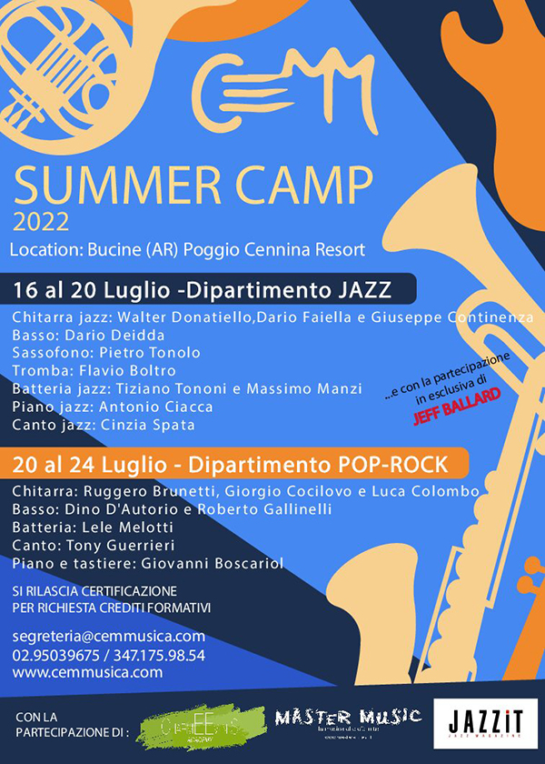 ll CEMM Summer Camp 2022, è un seminario estivo dedicato alla musica Jazz e alla musica Pop/Rock ed è aperto a tutti i musicisti professionisti e amatori, iscritti a scuole di musica, istituti musicali e Conservatori.