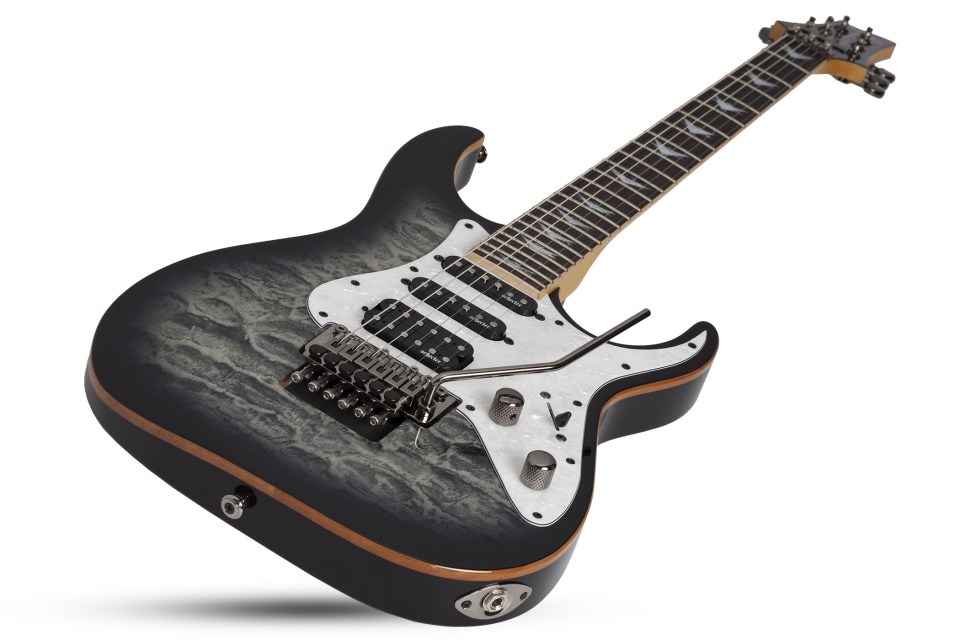 Salta subito all’occhio, oltre che la stupenda verniciatura lucida Charcoal Burst con top quilted a vista, la dotazione del ponte mobile Floyd Rose Special ‘Hot Rod’ Locking Tremolo, unito a un capotasto Floyd Rose Special, espressamente progettati per chi sviluppa con il proprio playing un controllo a 360° dello strumento, con ampio uso della leva.