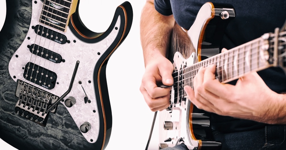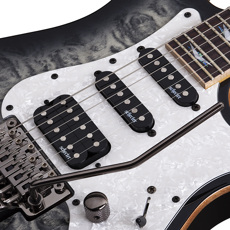 Per quanto riguarda l’elettronica, il potenziometro Push/Pull e il selettore a 5 posizioni danno la possibilità di avere molte combinazioni sonore, il tutto su una configurazione H-S-S dei pickup Schecter Diamond (single coil) e Diamond Plus (humbucker).