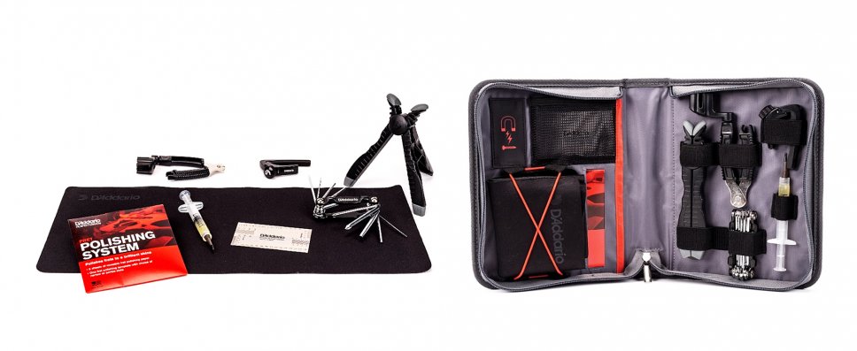 In una comoda ed elegante custodia con zip una serie di attrezzi in grado di coprire vari tipi di esigenze nella manutenzione della chitarra o del basso (versione separata).
