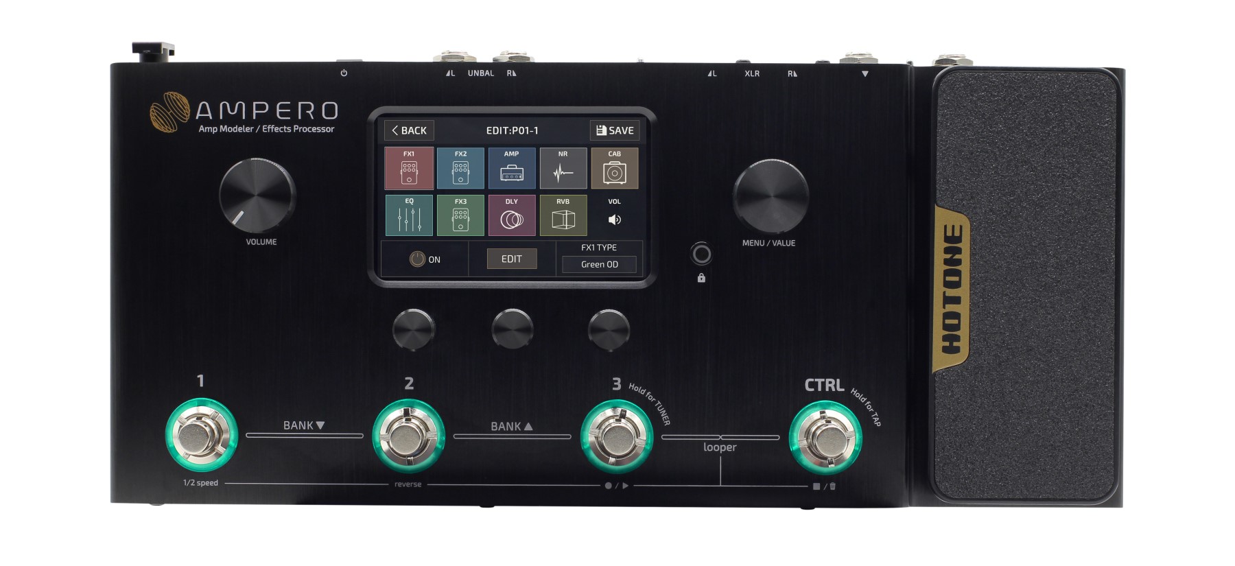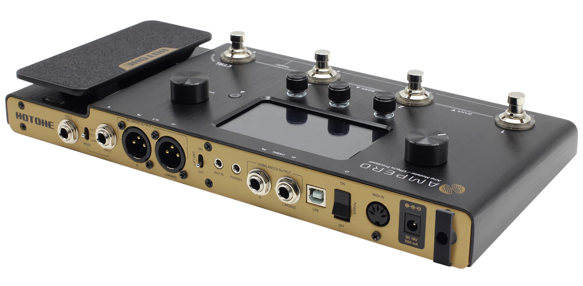 Questo sistema di Dual DSP è totalmente proprietario di Hotone, confezionato per Ampero in uno chassis sottile con un touch screen a colori ad alta definizione da 4 pollici.