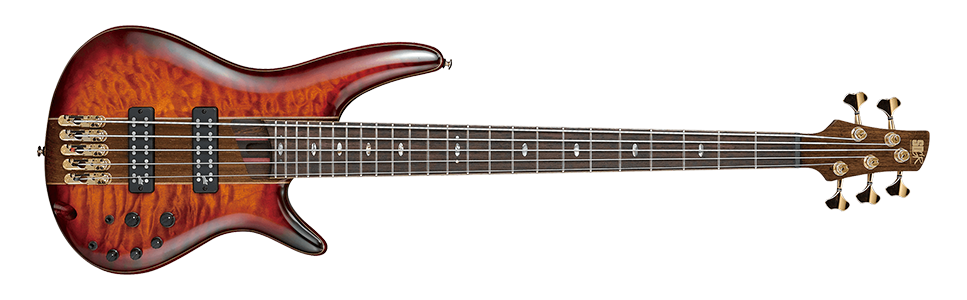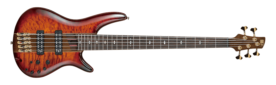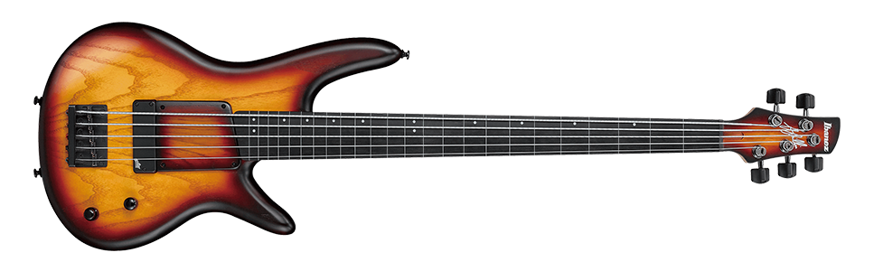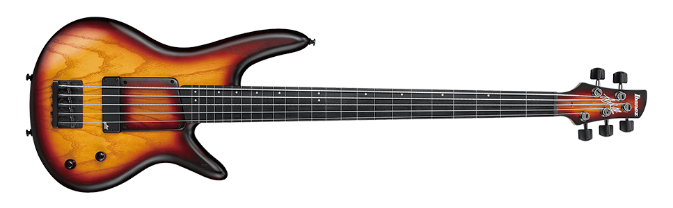 La voce dello strumento è affidata a una coppia di magneti Aguilar Super Double, abbinati all’elettronica Ibanez con 3 bande in boost/cut e switch di esclusione che attiva il potenziometro di tono passivo posto sugli alti. Anche in questo modello troviamo il ponte single rail MR5S e un capotasto Graph Tech BLACK TUSQ XL. Rifinito in Brown Topaz Burst, il modello è disponibile anche in versione 4 corde (colore Florid Natural).