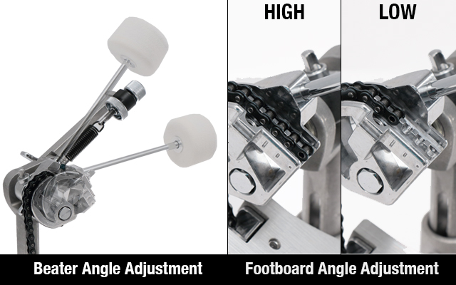 Utilizzando sempre una chiavetta per batteria e con estrema semplicità è poi possibile variare il grado di angolatura del battente o quello della pedana, anche in modo indipendente l’uno dall’altra. Facile da raggiungere, data la sua posizione in basso a destra, anche la farfalla che stringe il pedale a qualunque tipo di cerchio della cassa.