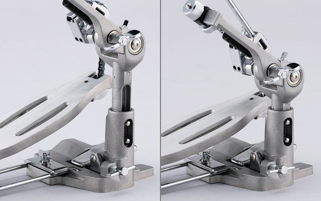 Al di sotto del blocco con la molla (ripiegabile su se stesso tramite una comoda farfalla, a beneficio della portabilità dell’accessorio), troviamo il nuovo meccanismo per regolare l’altezza del pedale, una sorta di guida che scorre all’interno di un semi-cilindro e che va bloccata all’altezza desiderata stringendo due viti con una normale chiavetta per accordare i tamburi. In questo modo, qualsiasi sia la dimensione della vostra cassa, il battente sarà in grado di colpire sempre il centro della pelle.