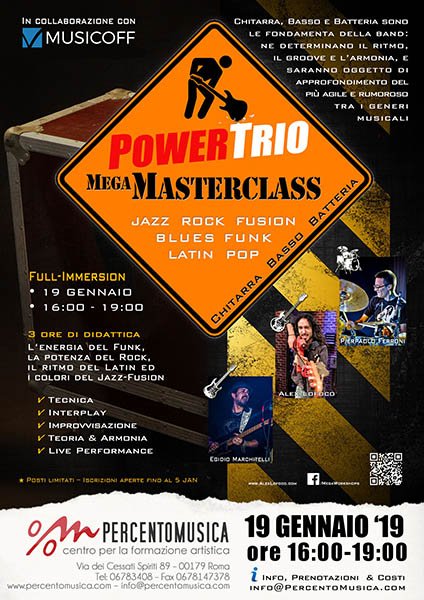 Da Percentomusica il 2019 inizia con la masterclass dedicata alla formazione power trio condotta da Alex Lofoco, Pier Paolo Ferroni ed Egidio Marchitelli.