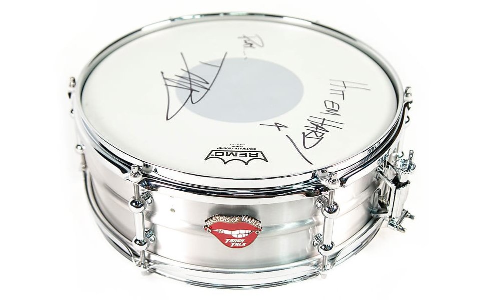 Si tratta di un tamburo in lega di alluminio che misura 14 pollici per 5,5. Denominato Trash Talk, è fornito di un badge a forma di labbra sormontate dal nome dell’azienda costruttrice, la statunitense Masters of Maple.