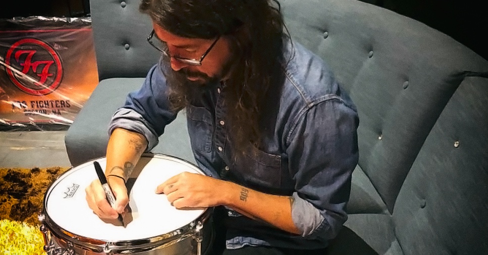 Sulla pelle battente, oltre alla sua firma, Dave Grohl ha anche scritto a pennarello “Hit Em Hard“, ossia “colpiscilo duro!“.