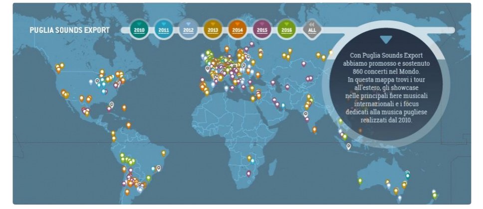 Il primo progetto, assegnatario della fetta più grande del finanziamento stanziato (200mila euro), è Puglia Sounds Export 2017. Il bando prevede la suddivisione dei partecipanti in base alle date internazionali maturate: nella categoria “young” rientrano gli artisti con un minimo di 2 e un massimo di 10 esibizioni all’estero, nella categoria “senior” rientreranno invece coloro che avranno totalizzato un minimo di 10 live fuori dal Belpaese; il progetto punta quindi da un lato a dare spazio ai talenti locali meno conosciuti, e dall’altro a valorizzare gli artisti che hanno già raggiunto una certa esposizione commerciale.