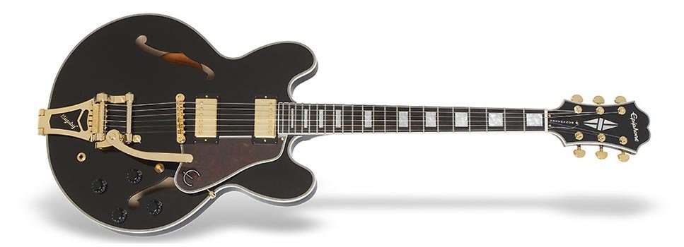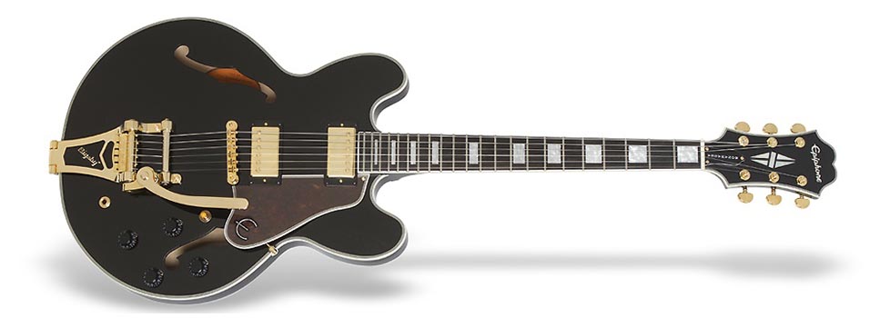 Anticipata sul finire del 2018, la novità firmata da Joe Bonamassa è la sua sesta signature con Epiphone. Si tratta di un design ES-355 dall’elegante finitura Ebony con il gradevole accoppiamento cromatico dell’hardware dorato. Body e top realizzati in tre strati acero-pioppio-acero, manico incollato con profilo D SlimTaper e tastiera in ebano con inlay in pearloid e capotasto Graphtech Nubone.