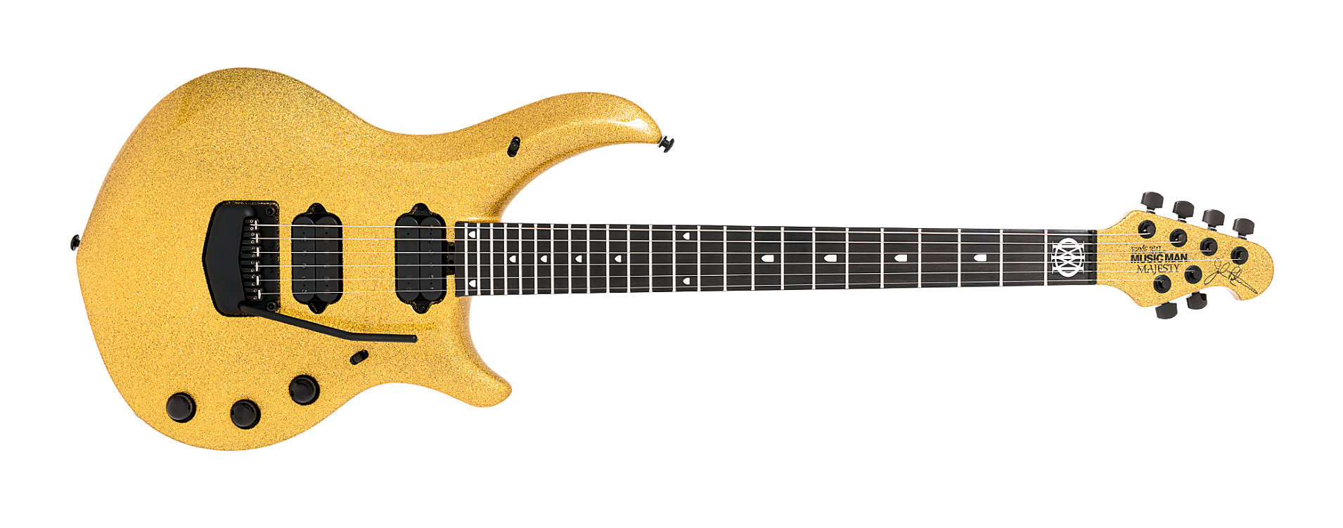Il carattere regale della Majesty è valorizzato dalla finitura Gold Sparkle riservata a soli 77 esemplari. La cassa è in tiglio per offrire un pizzico di calore in più al suono dello strumento e mostra una coppia di pickup humbucking con un tremolo Music Man John Petrucci.