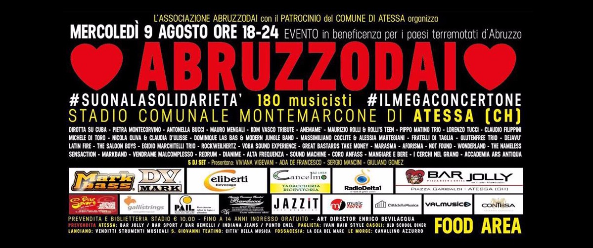 Realizzare un grande evento musicale a favore dei paesi abruzzesi colpiti dai recenti terremoti: l’ambizioso obiettivo dell’associazione AbruzzoDai si concretizza nell’appuntamento del 9 agosto prossimo allo Stadio Comunale Montemarcone di Atessa (CH). A supporto del progetto non potevano mancare le realtà locali Markbass e DV Mark, partner ufficiali nonchè backline dell’evento.