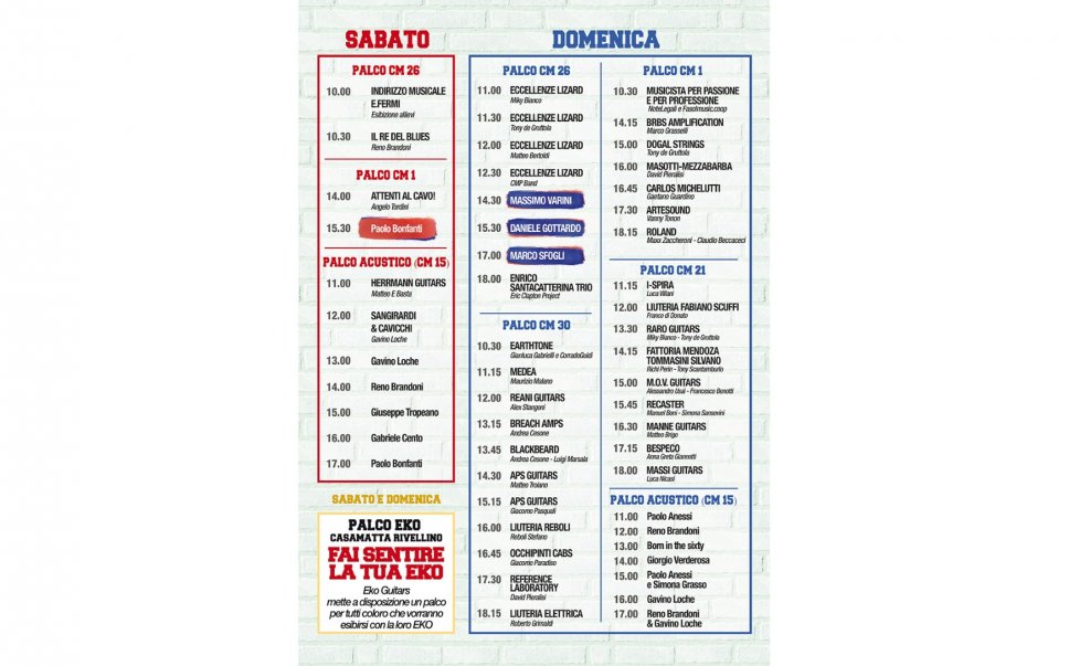 Spicca sicuramente il Palco CM 26, sul quale nella giornata di domenica (dedicata agli strumenti elettrici) si avvicenderanno Massimo Varini, Daniele Gottardo e Marco Sfogli, oltra a una selezione di eccellenze Lizard; da tenere d’occhio anche il Palco Acustico CM 15, attivo in entrambe le giornate dalle 11:00 alle 17:00, con Paolo Bonfanti come artista di punta. Una menzione particolare per il Palco EKO nella Casamatta Rivellino, dove i possessori di chitarre del brand marchigiano potranno esibirsi col proprio strumento.