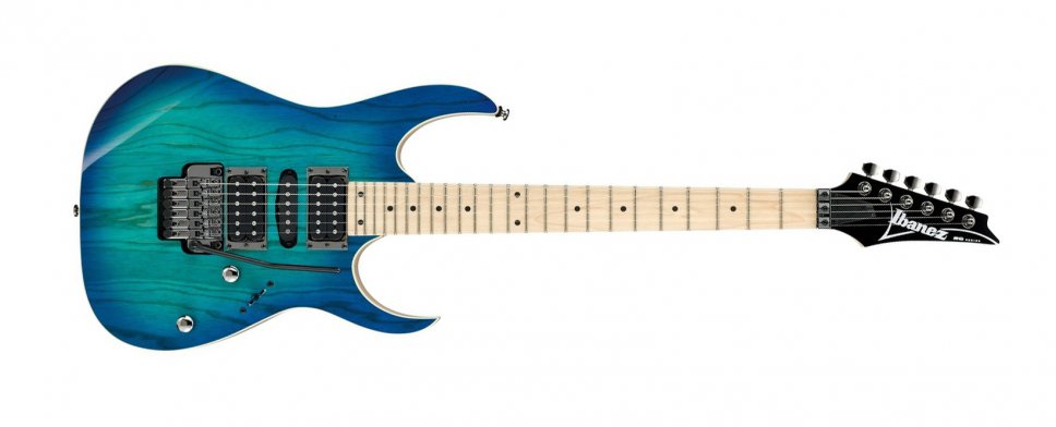 La RG370AHMZ sfrutta il contrasto fra la tinta Blue Moon Burst della cassa in frassino e l’acero del manico, con hardware nero e pickup Quantum, gli stessi della RG421M che ha cassa in mogano e ponte fisso.