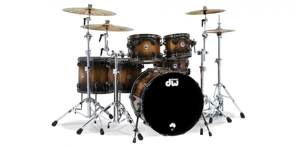 Inserita nel novero della DW Collector’s Series, la batteria Pure Tasmanian Timber ha i fusti realizzati con uno strato interno in Australian Blackwood, legno di straordinaria risonanza, ricoperto da uno strato esterno di Blackheart Sassafras, il tutto nell’elegante finitura laccata Quick Candy Black Burst to Natural, esaltata da un hardware nickelato sui fusti e corredato dal badge rotondo ‘personalizzato’, con tanto di profilo e bandiera dell’Australia.