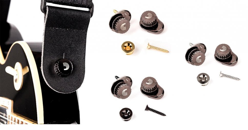 Cominciamo dal Dual Lock, un semplice ma efficace doppio aggancio della tracolla che si propone come alternativa economica ai sistemi più complessi. Consiste in una coppia di clip che si incastrano alle viti di sicurezza del body senza bisogno di interventi invasivi, prevenendo sganciamenti accidentali della tracolla; in aggiunta è possibile assicurare alla clip il cavo jack collegato allo strumento, evitando che questo si stacchi involontariamente durante la performance.