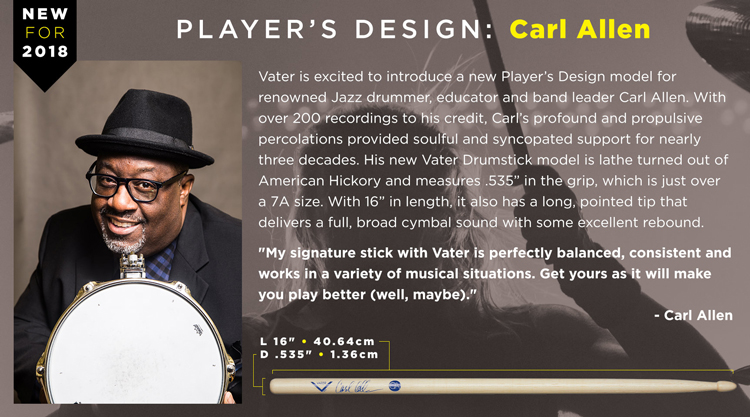 Un altro grande nome del batterismo mondiale si aggiunge alla nutrita famiglia degli endorser Vater: Carl Allen, jazzista tra i più registrati al mondo (oltre 200 album al suo attivo), ha ora un suo modello signature in hickory americano, con lunghezza standard 16″ (40.64 cm) e diametro poco maggiore rispetto a una 7A (.535″, ossia 1.36 cm); la punta è una acorn, lunga e appuntita, per un suono pieno e corposo sui piatti con un grande rimbalzo, particolarmente adatto appunto ai batteristi jazz.