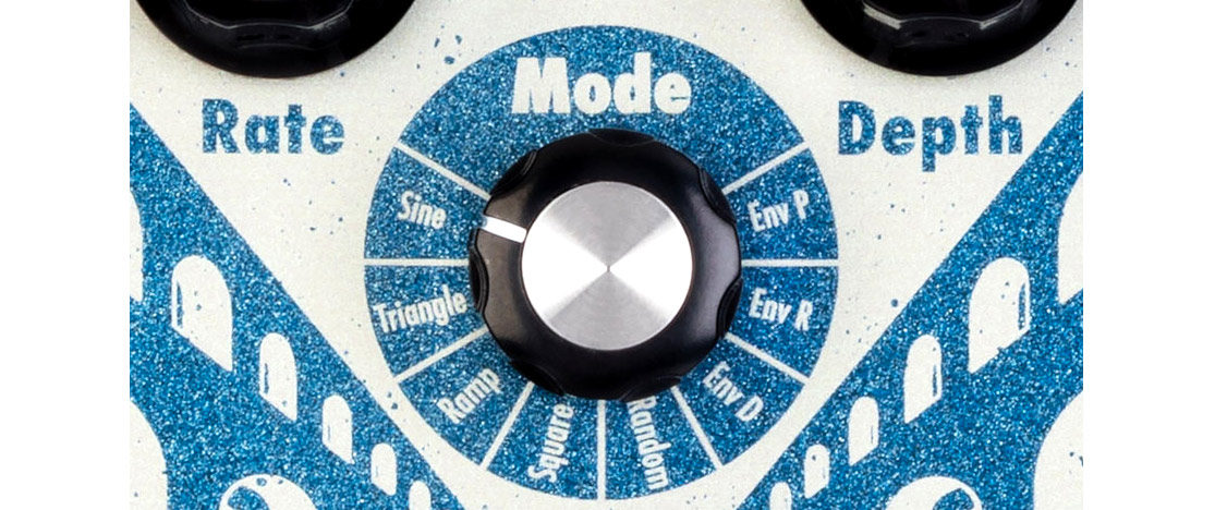 - Env D: Profondità dell’effetto a controllo d’inviluppo. Un’onda sinusoidale controllata in velocità dal controllo Rate, mentre Depth serve a determinare il punto in cui l’effetto viene innescato dalla mano dello strumentista. Intensità di modulazione proporzionale alla forza della pennata sulle corde.