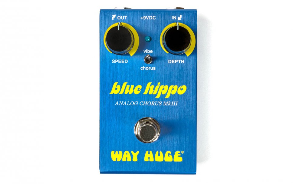 Il Way Huge Blue Hippo Analog Chorus MkIII è dotato anche di un Vibe switch per aggiungere quel gustoso tocco di vibrato, controllato con le stesse manopole Speed e Depth dedicate al chorus di base. Caratteristiche di alimentazione simili al precedente, compresa la protezione del circuito da scompensi di rete.