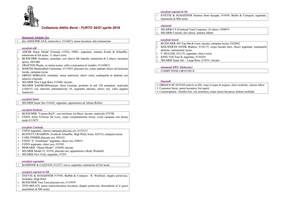 Di seguito (clicca sull’immagine per ingrandirla e poi su “immagine originale” per scaricarla) l’elenco completo dei sassofoni rubati. La preghiera è di avvertire gli organi competenti e in particolare la polizia postale nel caso comparissero annunci di vendita su Internet o sui vari social network.