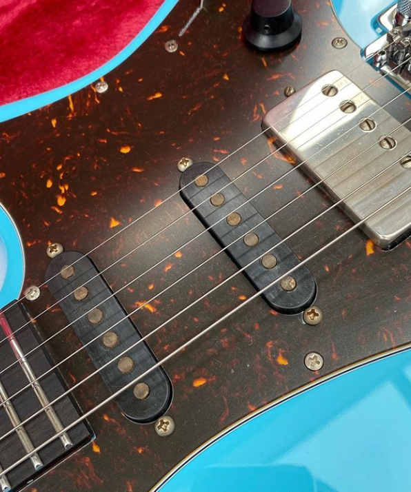 La chitarra colpisce da subito per la bella colorazione in Daphne Blue, tra l’altro una verniciatura completamente in nitrocellulosa, come richiesto espressamente da Quayle.