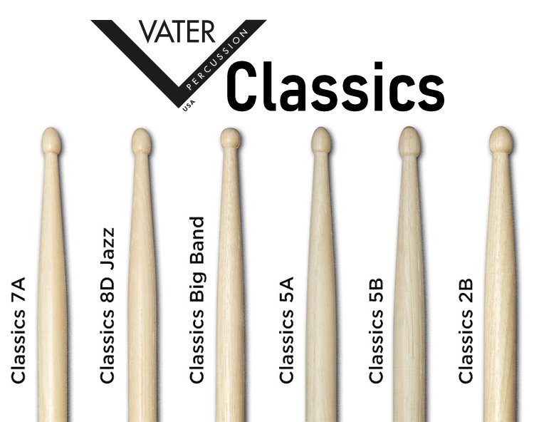 Le bacchette Vater Classics sono state realizzate in legno di hickory (noce americano) nelle misure comunemente più utilizzate e vendute: 7A, 5A e 5B (punta ovale), 2B (punta ovale, ma più compatta e larga), 8D Jazz (punta a oliva più fina e smussata), Big Band (punta tonda).