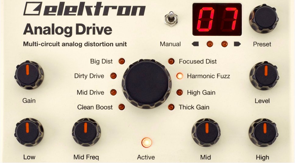 Elektron Analog Drive è l’ideale per i chitarristi più creativi ed esigenti, per chi ha bisogno di un buon numero di colori senza alterare troppo la base naturale del proprio suono.