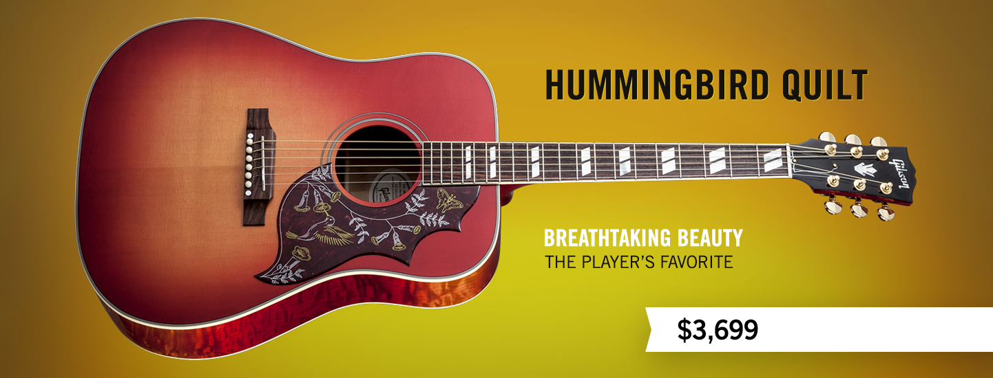 Prima fra le tre ad essere presentata è la Hummingbird Quilt, chitarra dreadnought con top in abete sitka e fondo e fasce in acero. Il look decisamente accattivante del cherry burst è rinforzato da inserti in madre perla per l’headstock, meccaniche Grover Rotomatics e tastiera in palissandro con radius 12″ rifinita con binding color crema. La nuova Hummingbird Quilt è stata presentata con uno “street price” di $3699.
