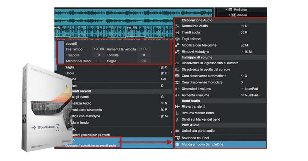 Studio One 3 vi permetterà di lavorare sulla trasposizione, sulla tonalità e sulla velocità anche di una traccia audio: questo potente software è in grado infatti di modificare in tempo reale queste importanti caratteristiche dell’onda senza l’interruzione del vostro playback. Provate a cambiare i campi e i numeri relativi a queste voci e osservate il risultato.