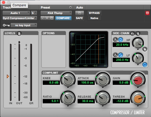 È bene ricordare che noi il SC non lo sentiamo anche se influenza il comportamento del compressore e così, usando ad esempio il compressore incluso in Pro Tools, che ha già un EQ potente inserito nel SC, possiamo creare una risposta che renda possibile controllare il battente (circa 1000-2500 Hz) senza che la componente bassa (50-100 Hz) intervenga sulla soglia di compressione. Un passa-alto a 250 Hz renderà possibile ottenere il risultato.