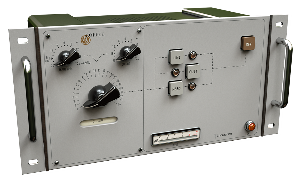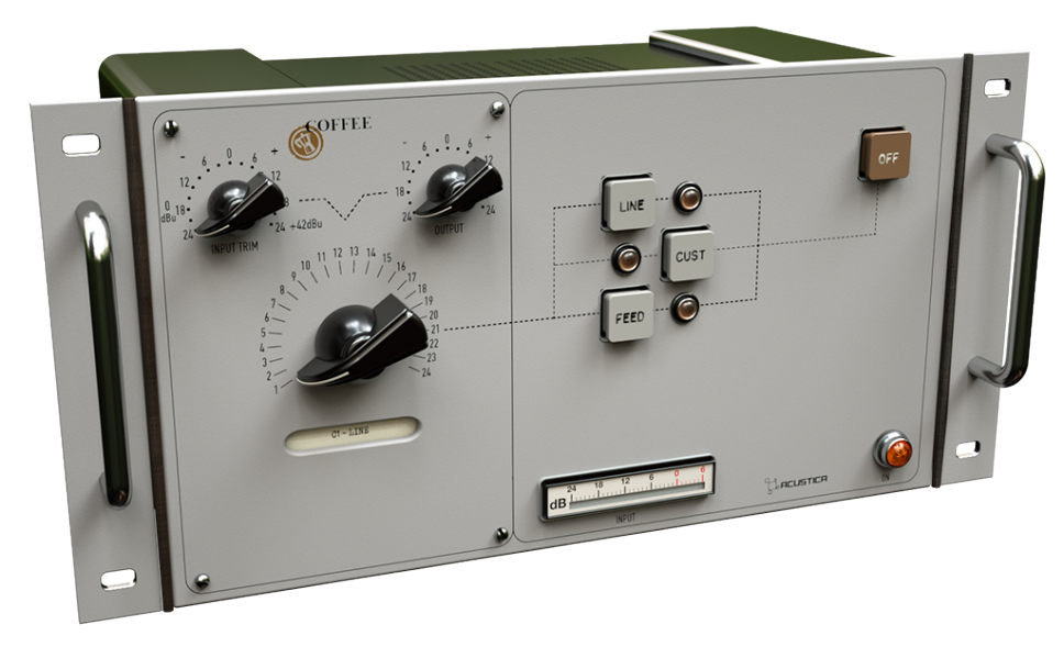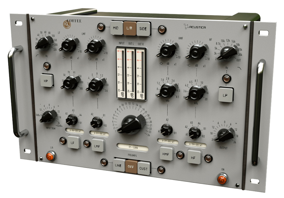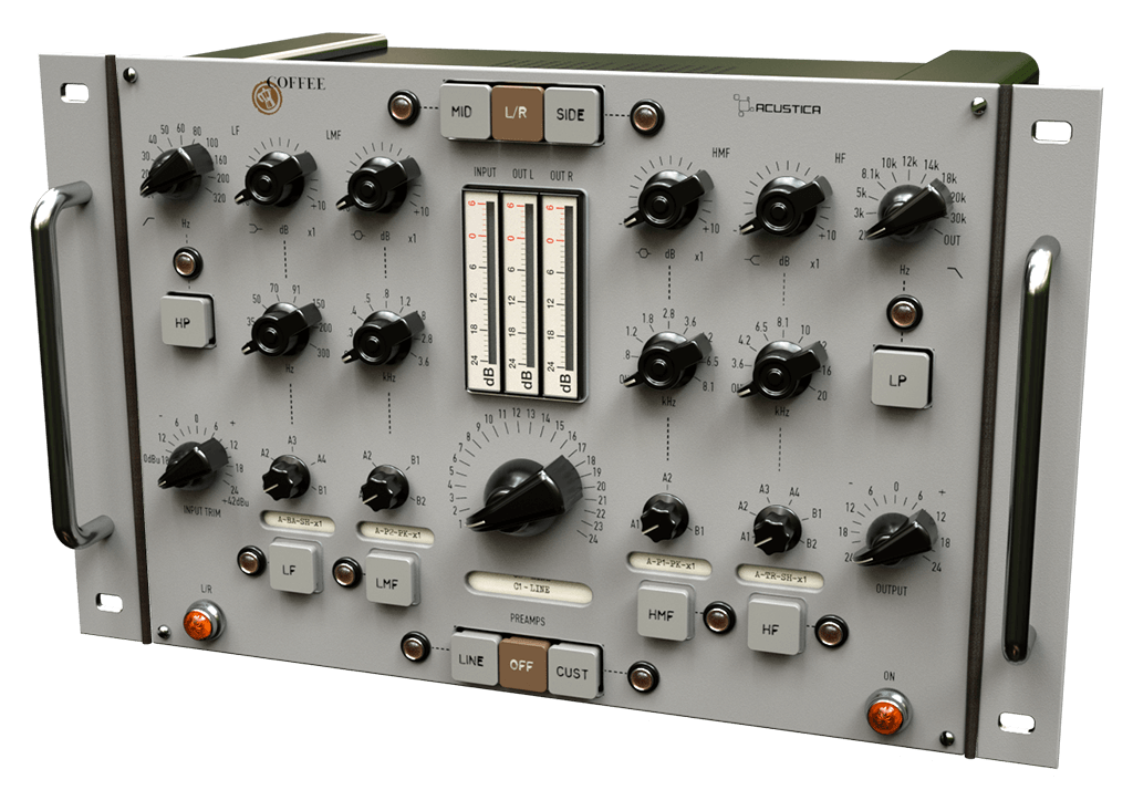 Coffee racchiude sei diverse unità hardware fuse in due diversi EQ, una sezione filtro HP/LP, cinque processori di dinamica tra cui un limiter, più una sezione preamplificatrice con 31 diverse emulazioni.