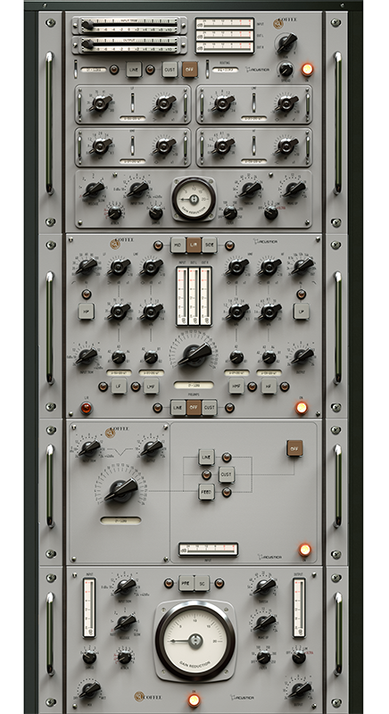 La parte dedicata a channel strip e compressori vede quattro processori di dinamica derivati da due diverse unità: un compressore valvolare Vari-mu e un compressore/limiter a componenti discreti accoppiati a trasformatore.
