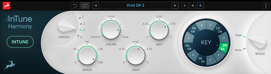 InTune Harmony genera armonie vocali istantanee, aggiungendo 2, 3 o 4 voci armoniche alla voce originale. Con la possibilità di regolare chiave e scala, gli utenti possono creare armonie personalizzate, spaziandole nel panorama stereo con il controllo Space e modificando il timbro con il controllo Color.