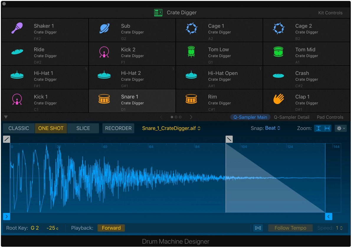 I suoni di Drum Synth possono essere utilizzati su qualsiasi pad in Drum Machine Designer, dove è anche possibile mixarli a campioni per ottenere il risultato che si vuole.