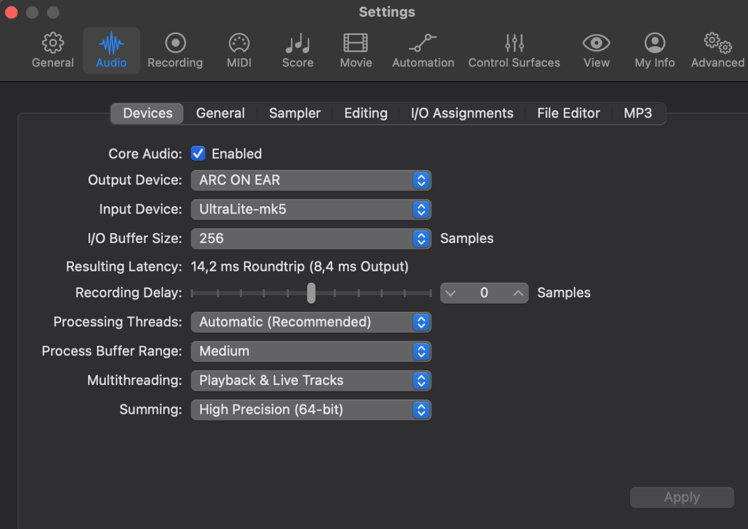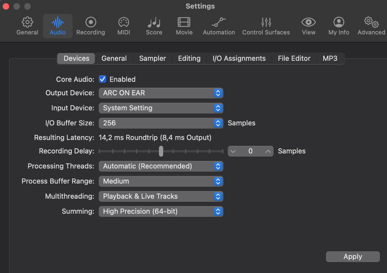 Ho quindi voluto effettuare una stima approssimata attraverso logic pro, per avere quantomeno un’idea della latenza datami dal driver audio, utilizzando un buffer size di 256 e tenendo connessi usb sia l’ARC on Ear che la mia scheda audio, sia il solo correttore.