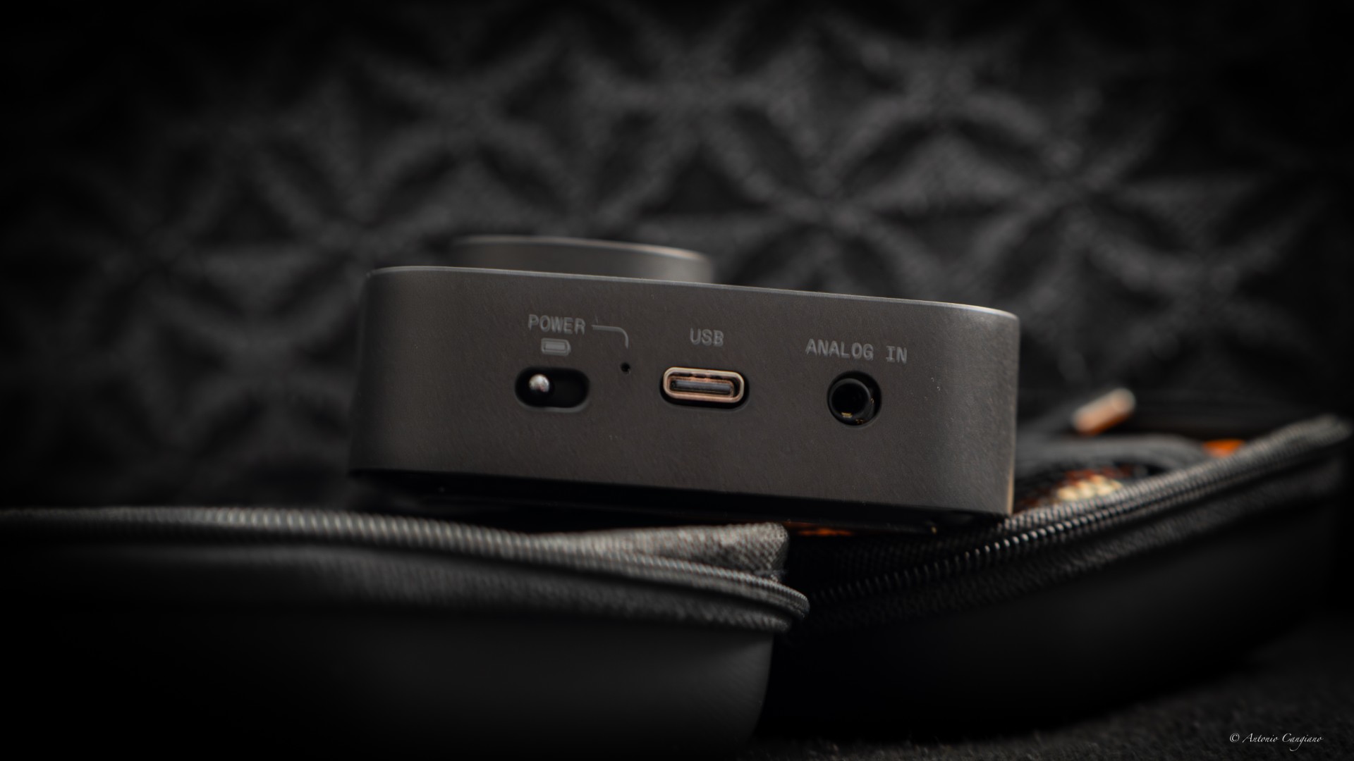 Sui lati abbiamo i tasti di accensione, collegamento analogico, digitale attraverso USB e l’uscita cuffia, il tutto unito alla sua custodia dedicata e due cavi matchati per colore all’ arancio delle scritte.