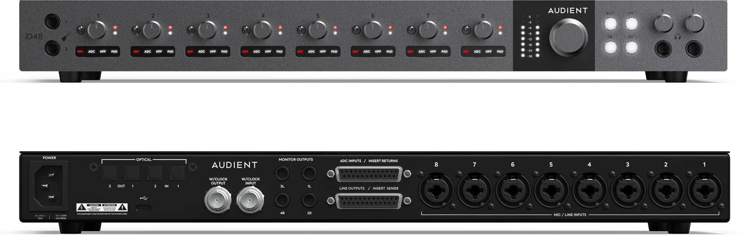 La iD48 è dotata degli stessi preamplificatori presenti nella console di punta Audient ASP8024-HE, caratterizzati da bassissimo rumore e distorsione. Ciascun canale offre fino a 68 dB di gain, con controlli dedicati per +48V phantom power, pad, boost da +10dB, inversione di polarità e filtro passa-alto.