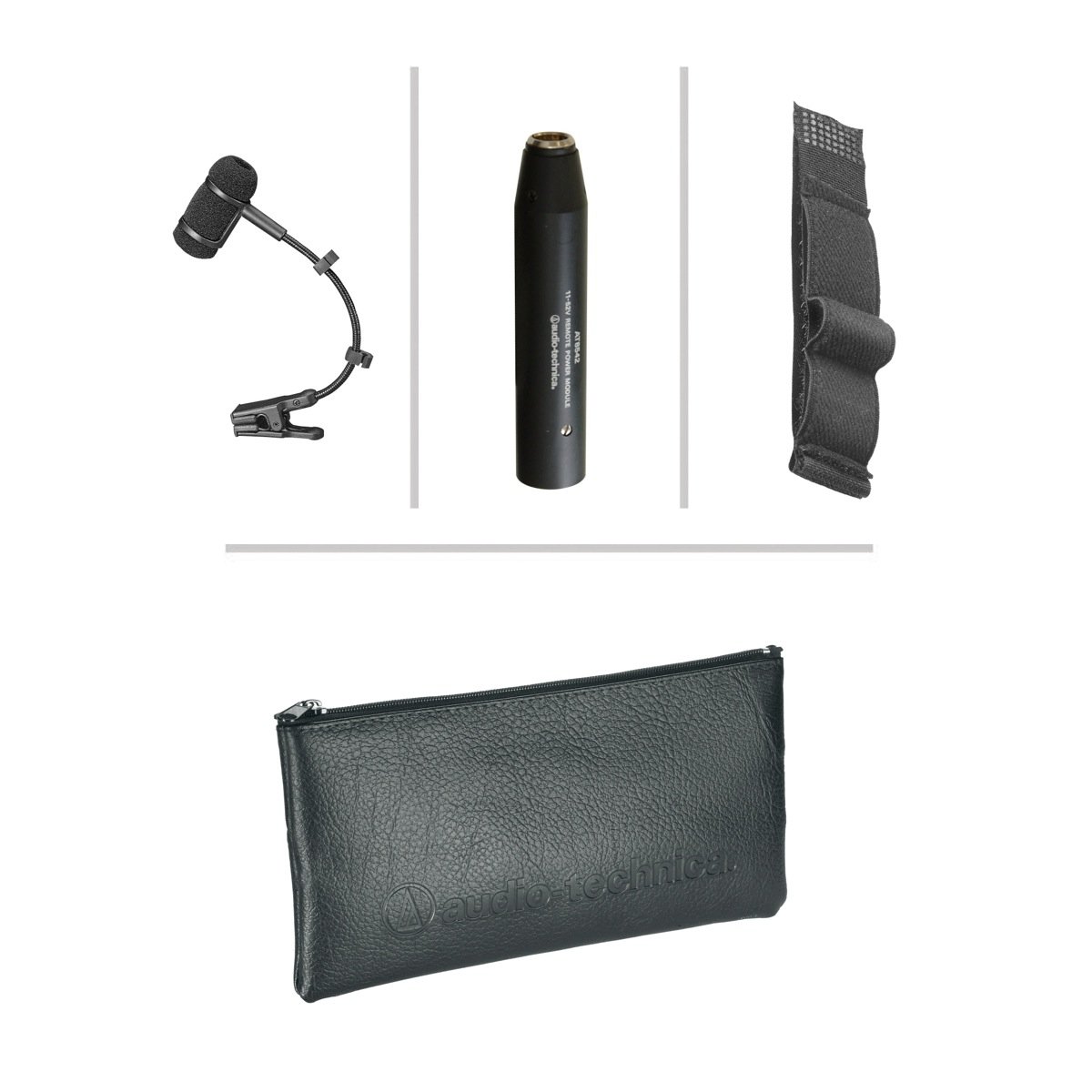 - ATM350UcW: è la versione per radiomicrofono, con flessibile AT8490, montaggio universale AT8491U, custodia rigida, velcro AT8468.