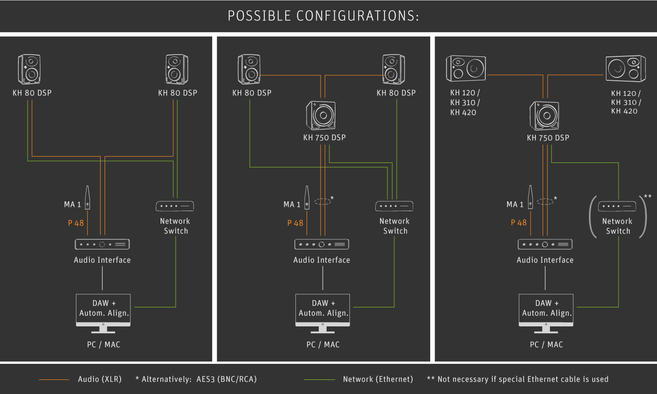 Utilizzando il subwoofer KH 750 DSP, è possibile utilizzare anche una coppia stereo di monitor Neumann serie KH senza porta ethernet. Il KH 750 DSP ha una potenza di elaborazione sufficiente per allineare l’intero sistema, compresi i due monitor collegati alle sue uscite XLR.