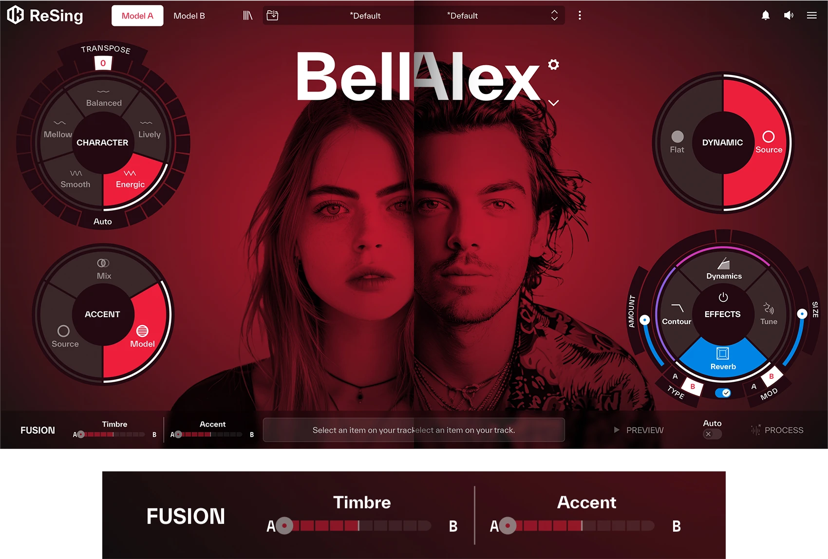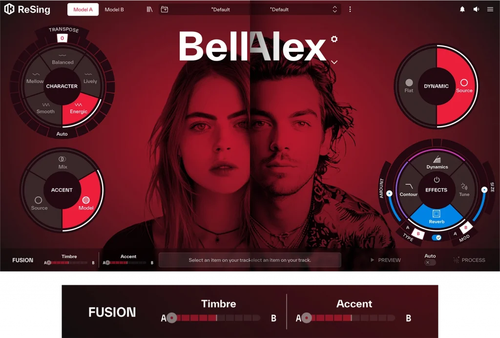I controlli principali includono Transpose (cambio di tonalità senza perdita di naturalezza), Character (dalla voce calda a quella brillante), Accent (propria pronuncia, quella del modello, o un mix) e Fusion, che permette di ibridare due modelli in una voce inedita.