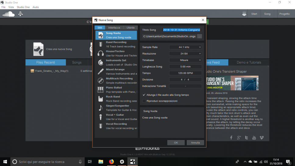 Non ci sono stati problemi di alcun tipo, d’altronde nel caso della studio 1824 sarebbe stato quasi impossibile dato che è sempre di casa Presonus. Dopo aver scelto la scheda e impostato i vari parametri di registrazione (sample rate, buffer ecc.), ho potuto quindi creare la Song (termine usato dallo stesso Studio One).