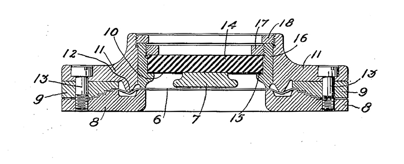 Il backplate è separato dal diaframma da una pellicola molto sottile con spessore di circa 12 micron. In questo brevetto il diaframma era una lamiera di acciaio portata al suo limite di circa 28 micron. Un pezzo di mica separava la piastra ed il diaframma, tenuto saldamente in posizione per creare una camera d’aria a tenuta stagna, con la funzione di cuscinetto.