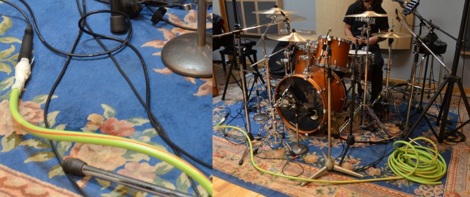 Per la ripresa del rullante il classicissimo SM57 è stato affiancato da un Earthworks SR25, un cardioide con una risposta molto lineare fino a 25k che ha aggiunto un carattere diverso, Earthworks MD20 sono stati usati per tom & timpano. Altra soluzione interessante, anche se questa è quasi uno standard per Sylvia, è stato il tubo dell’acqua con un 57 nastrato alla fine, mentre l’inizio del tubo era vicino la batteria… esperimento da ripetere e applicare spesso.