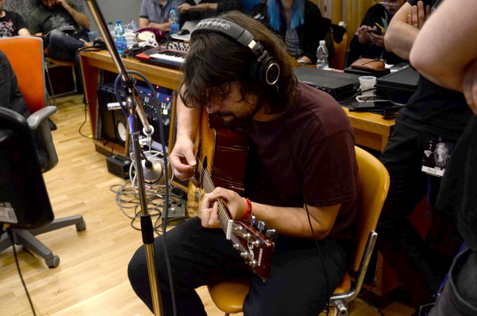 Federico Dragogna dei Ministri durante la registrazione della chitarra acustica