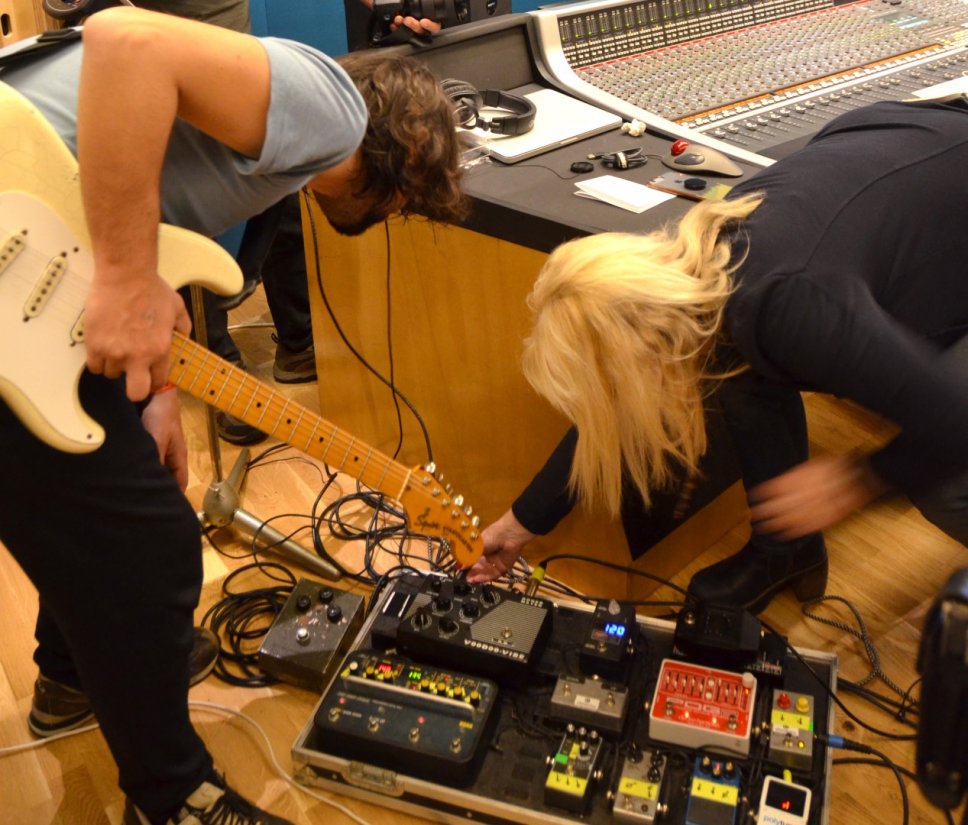 Sylvia Massy sistema il microfono davanti la chitarra di Federico Dragogna (Ministri)