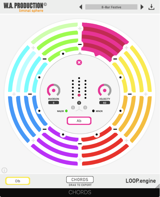 Un loop di CHORDS può contenere fino a 8 accordi, ognuno composto al massimo di 4 note… esempio la triade classica più una nota ulteriore (per esempio una settima o una nona). Il pieno controllo dei loop passa attraverso due interfacce grafiche tra loro interconnesse: LOOP CONTROL, per gestire l’intero loop, e CHORD CONTROL per gestire le impostazioni di ogni singolo accordo.