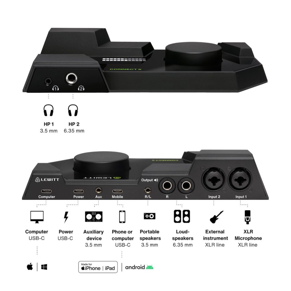 Come potete vedere dai moltissimi video esplicativi e in continuo aggiornamento del sito Lewitt, Connect 6 è dotato di molte connessioni hardware, integrazione completa per dispositivi iOS/Android, preamplificatori da studio con suono eccellente, potente processing DSP integrato, mixer, canali virtuali e il software Control Center per gestire facilmente i flussi audio per qualsiasi vostra esigenza specifica.