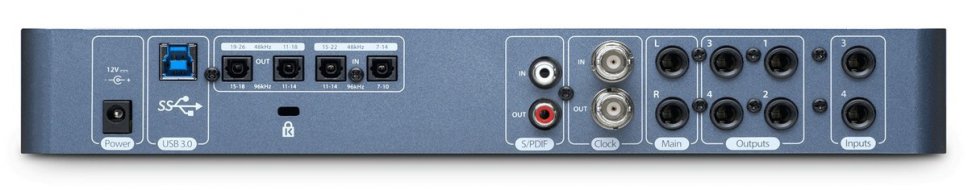 Sul retro sono presenti invece due ingressi Instruments, 6 Out da dedicare agli ascolti come casse e cuffie secondarie, la connessione BNC WordClock, le doppie uscite ADAT per il sistema SMUX adatto ad aggiungere 8In e 8out fino a 192kHz. Infine la connessione USB3 e l’alimentatore.