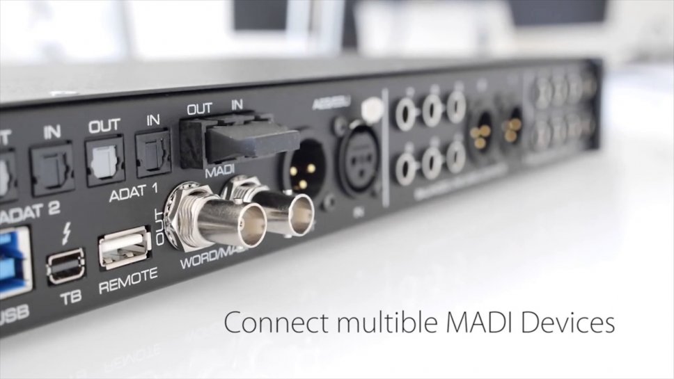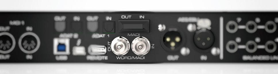 Sul pannello posteriore ritroviamo gli 8 In e 8 Out in formato TRS e XLR per il canali 1 e 2. L’uscita e l’ingresso AES/EBU, le connessioni BNC per il clock esterno, gli ingressi e uscite MADI, gli ingressi e uscite ADAT doppi (16 canali), la connessione Remote USB per il controller ARC, le connessioni Thunderbolt e USB3 per il computer, un In e Out Midi supplementare, l’alimentazione generale.