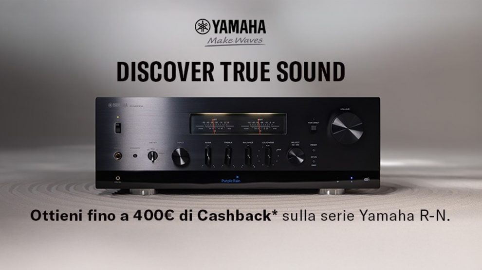 Cashback Yamaha fino a 400 euro sui sintoamplificatori stereo R-N, promozione valida dal 14 aprile al 1° giugno 2025.